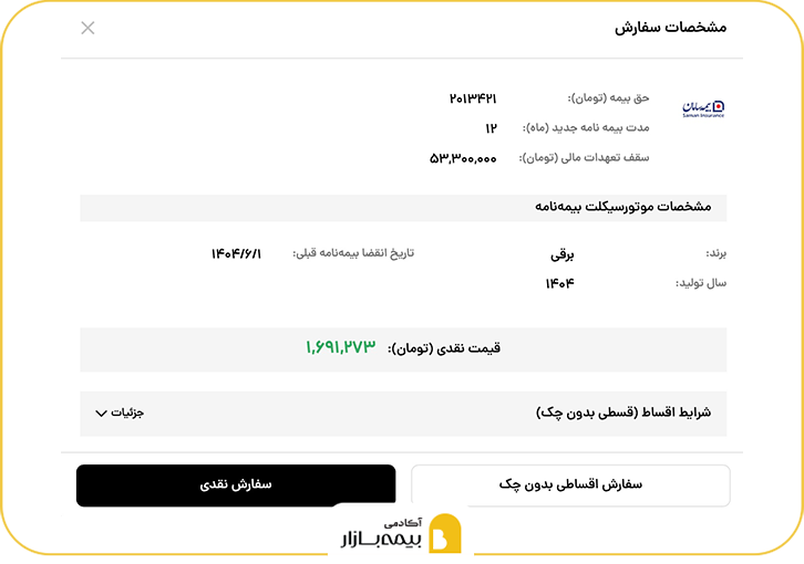 پس از انتخاب شرکت بیمه مورد نظر، میتوانید به طور اقساطی یا نقدی، بیمه موتورسیکلت را ثبت سفارش کنید.