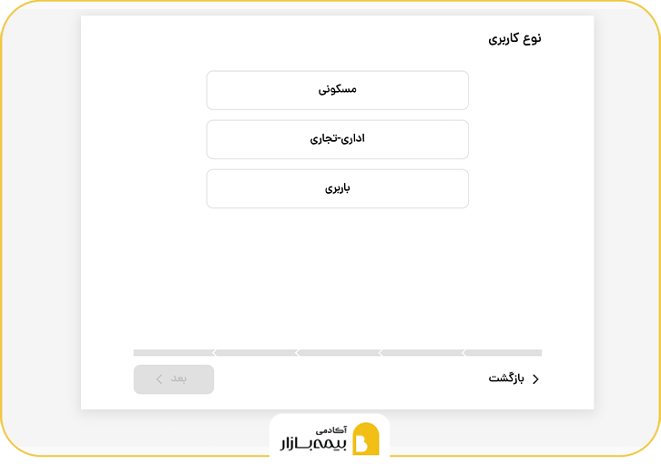 نام، کد ملی، شماره تماس، آدرس کامل ساختمان و سابقه حوادث قبلی را با دقت وارد کنید. این اطلاعات مستقیماً در بیمهنامه ثبت میشوند و به همین دلیل باید خیلی دقیق وارد شوند.