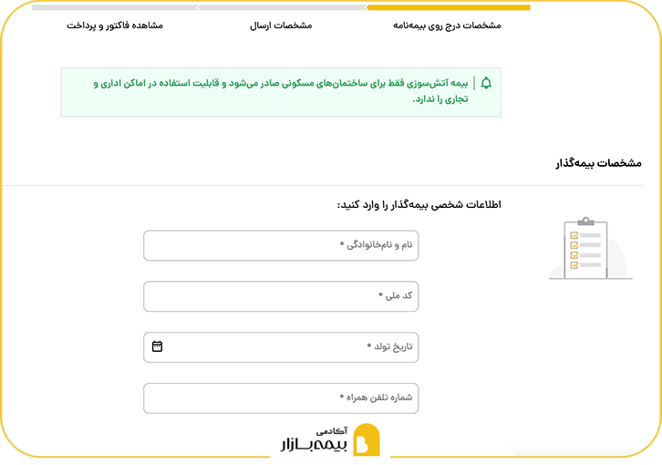 پس از انتخاب طرح مناسب، باید اطلاعات بیمهگذار را بهصورت دقیق و کامل وارد کنید. اطلاعاتی مانند نام، کد ملی، آدرس و محل سکونت و ارزش تقریبی ساختمان و اموال داخلی، از جمله اطلاعاتی هستند که در صدور بیمه آتش سوزی نقش اساسی دارند. دقت در وارد کردن این اطلاعات، تضمینکننده صحت بیمهنامه صادرشده و پذیرش آن در زمان خسارت است.