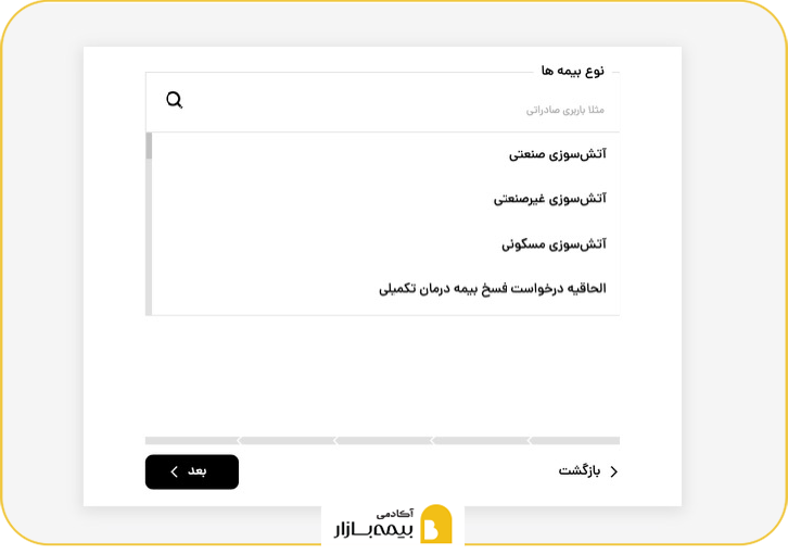 برای شروع باید وارد پنل شرکای بیمه بازار شوید. در پنل کاربری و در منوی اصلی، دستهبندی بیمهها قابل مشاهده است. انتخاب نوع بیمه، اولین گام برای ورود به فرآیند صدور است. رابط کاربری پلتفرم طوری طراحی شده که حتی اگر با نوع بیمهنامه آشنایی کامل نداشته باشید، بهراحتی و به صورت مرحلهبهمرحله اطلاعات لازم را وارد خواهید کرد و مراحل را پشت سر میگذارید.